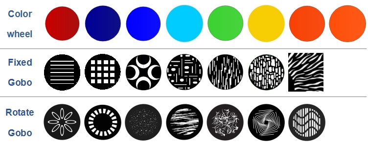 8-Colors + 6 Rotate gobos + 7 static gobos