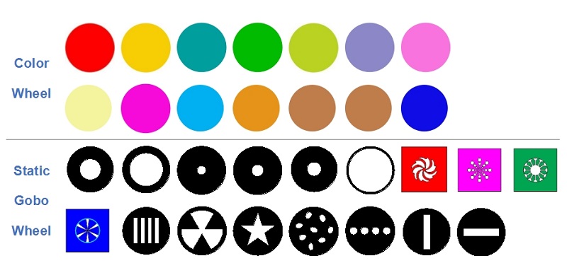 Static Gobo: 17 metal gobos + blank, gobo with shaking effect