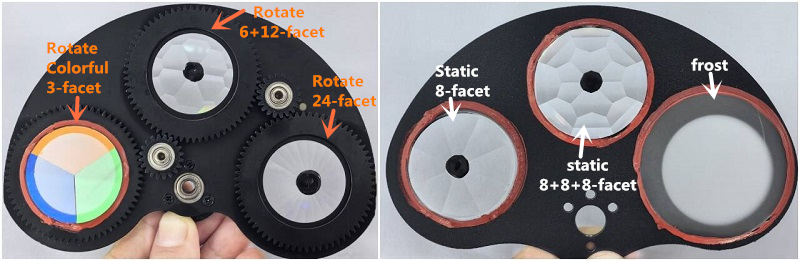 Prism 1: rotate color 3-facet Prism + rotate 6+12-facet Prism + Rotate 24-facet Prism;